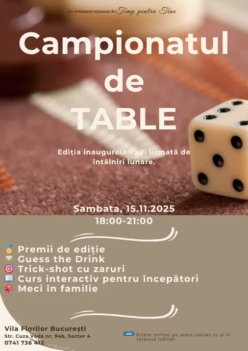 Campionatul de Table „Timp pentru Tine” debutează cu ediția inaugurală organizată la Vila Florilor București, sâmbătă, 15 noiembrie 2025, între orele 18:00 și 21:00. Evenimentul marchează începutul unei serii lunare de întâlniri dedicate pasionaților de table, dar și celor care vor să descopere acest joc într-o atmosferă relaxată și elegantă.