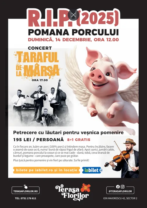 Iar pentru veșnica pomenire... a porcului, de la ora 17.00, petrecerea continuă cu celebrul Taraf de la Mârșa, care ne vor cânta multe lăutărești și muzici tradiționale! Nu ratați ocazia de a celebra românește, cu suflet și bucate alese!